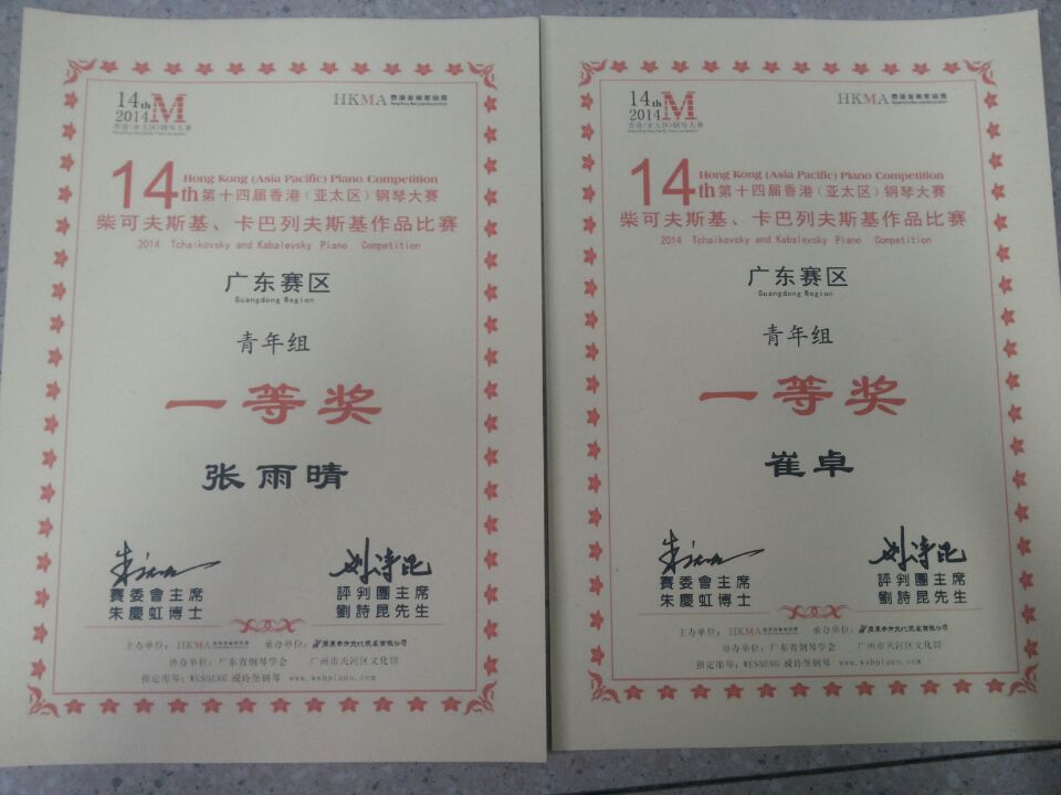 2014年10月18日,由香港音乐家协会主办的、以卡巴列夫斯基和柴可夫斯基作品作为主题的第十四届香港(亚太区)钢琴大赛在广东比赛。在我校音乐舞蹈学院青年教师薛碧芸的指导下,音乐舞蹈学院2013级音乐学专业张雨晴、音乐表演专业崔卓同学以自己娴熟的技艺和对钢琴的热爱,双双荣获青年组一等奖,并同时获准参加香港总决赛。当晚,崔卓同学代表比赛选手参加了颁奖音乐会的演出。我校在本次比赛中获得最佳组织奖。