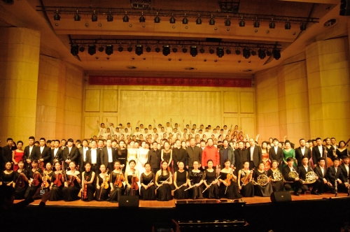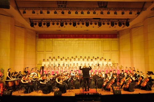 副校长孙先科,校工会主席岳杰勇,校党委办公室,党委宣传部等单位相关领导,音乐舞蹈学院,各兄弟院系的领导和数百名观众一同欣赏了音乐会。音乐会结束后,部分领导嘉宾上台与演职人员合影留念。