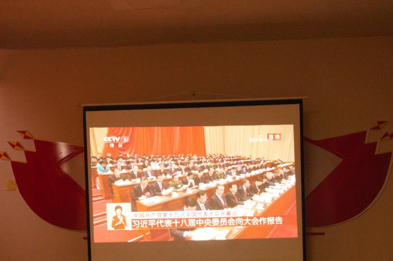 开幕式伊始,全体师生党员及学生干部与大会同步,起立共唱中华人民共和国国歌,并心怀崇敬齐为已故的老一辈无产阶级革命家和革命先烈默哀。随后,认真观看聆听习近平总书记向大会所作的报告,并作好记录,听到精彩之处,大家都报以热烈的掌声。