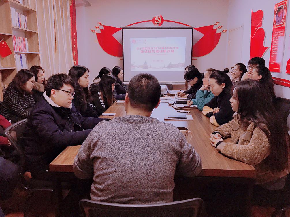 1月24日、25日,音乐舞蹈学院在音乐楼人民文艺工作坊举办面试技巧培训会并组织毕业生参加河南省--教育部直属师范大学2018届免费师范毕业生双向选择就业专场供需见面会。毕业班辅导员樊晓腾就面试技巧为学院2018届部分毕业生进行培训指导。