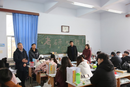 在研究生考试临近之际,为鼓舞考研学生信心,舒缓备考心理压力,12月2日上午,院党委书记侯帅、院长张伟带领班子成员及各年级辅导员深入考研教室,慰问我院考研学生。