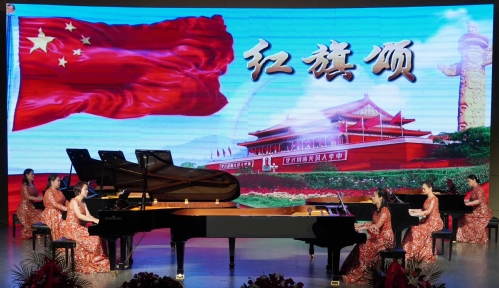 音乐会在六位钢琴教师共同演绎的《红旗颂》中拉开序幕,旋律时而悲壮激昂,时而婉转悠扬,使观众充满力量、热血沸腾。钢琴独奏《春舞》《前奏曲NO.3》《松花江上》通过优美动听的旋律表达了对祖国大好河山的赞美之情。钢琴重奏《太阳出来喜洋洋》《我和我的祖国》《梁祝》《黄河颂》以喜庆、抒情、激昂的风格表现出对祖国的忠贞与热爱。最后,音乐会在乐曲《保卫黄河》振奋人心的旋律和铿锵有力的节奏中圆满结束。本场音乐会作为钢琴系庆祝建党100周年重要活动之一,由钢琴系精心策划,全体教师通过选取了不同年代、不同风格的多部红色经典音乐作品,回顾党的光辉历程,讴歌礼赞新时代。