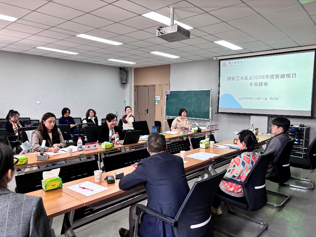 4月1日下午,我院国家艺术基金2026年度资助项目专家辅导会在二楼会议室举办。此次辅导会特邀国家艺术基金河南办公室副主任明巧玲、工作人员靳晴作申报技巧与经验分享,副院长魏波、拟申报教师以及学院骨干教师参会聆听。本次辅导会由副院长师玉丽主持。