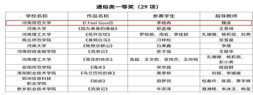 近日,由河南省教育厅、共青团河南省委等部门联合主办的第二十届河南省大学生科技文化艺术节各项赛事成绩公布。我院学子在本届赛事中表现优异,成绩斐然,荣获一等奖四项、二等奖四项、三等奖一项,充分展现了我院师生扎实的专业功底和积极向上的精神面貌。