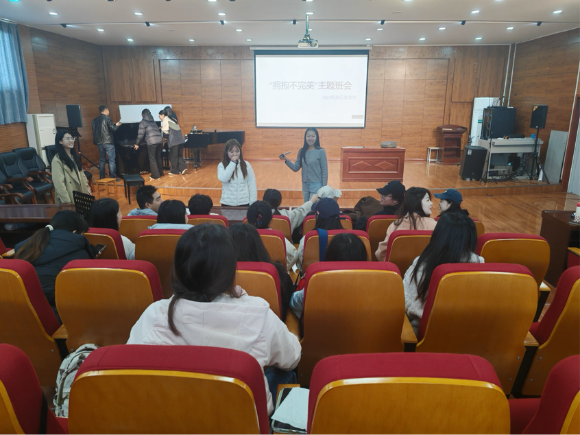 为引导同学们正确看待自身缺点、缓解成长压力,营造积极健康的班级心理氛围,10月30日上午,2023级音乐表演班在音乐楼501教室成功举办了以“拥抱不完美,与自我温暖对话”为主题的心理健康班会。