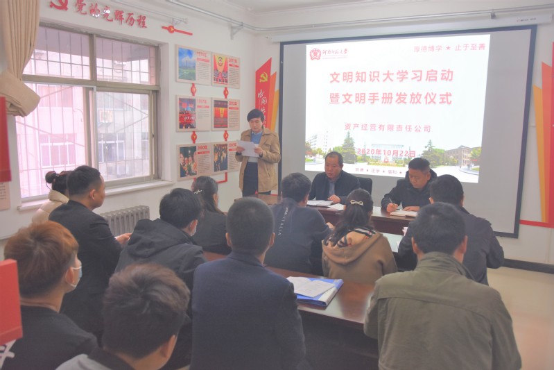 为落实学校文明创建要求,不断提升师生员工文明素质和文明知识水平,营造文明和谐的校园环境,10月22日,资产经营有限责任公司在党建活动室召开会议,举行校园文明手册发放暨文明知识大学习启动仪式。公司负责人、公司员工和全体校园商户承租人代表参加了会议。会议由直属党支部书记张新文主持。