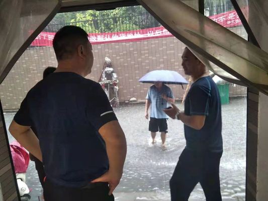 在东区4号公寓快递中心,杨海山总经理看到这里屋外的积水已经达到20公分左右,水泵的排水能力远远不足,当场与后勤处联系,协调相关部门,加放一台抽水泵,加大排水能力,同时要求快递中心工作人员,加强责任心,及时反映问题,及时关注雨情,做好值班和消防安全工作,确保在大雨、大汛面前,同心协力,对困难和问题想得更多一点,准备工作更充分些,确保汛期商户的正常运营。