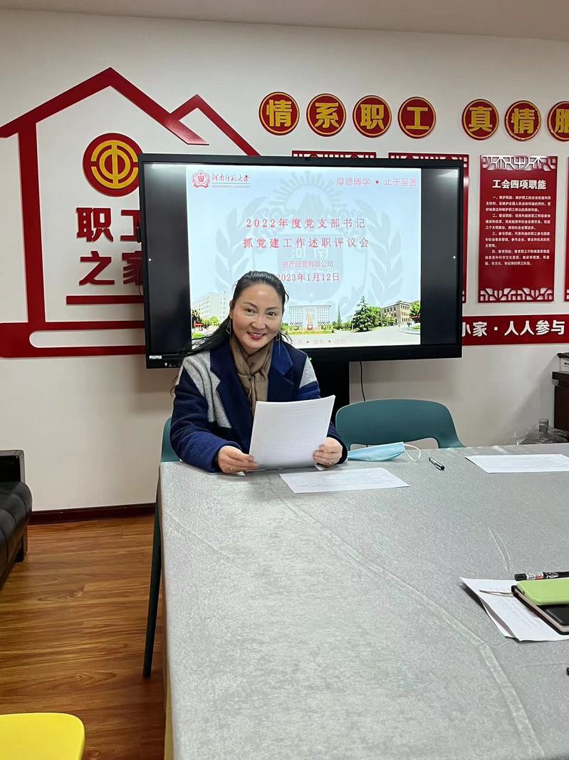 党总支书记张新文对2名党支部书记抓党建工作述职情况进行了点评,他指出在过去的一年里,公司第一、第二党支部能够认真贯彻落实中央及上级部门的部署要求,全面落实各项党建工作任务,突出重点,创新举措。特别是在学校疫情防控工作中,公司第一、第二党支部党员充分发挥战斗堡垒和先锋模范作用,全力助力学校疫情防控工作。他结合述职情况,客观分析了第一、第二党支部在工作中存在的问题,就下一步工作,他提出三点建议:一、继续学习宣传贯彻党的二十大精神,营造干事创业的良好氛围,以高质量党建,引领公司高质量发展,加强对党支部工作的领导,指导党支部建设工作,推进党支部工作进一步制度化、规范化和标准化。 二、加强调查研究,党建深入融合公司中心工作,完善党建制度工作体系,准确把握党建工作内涵和实质,结合公司中心工作开展形式多样的党建活动,并结合实际制定相应规章制度,达到指导实践、推动工作,提高管理效能。三、创新党建工作方式方法,强化活动效果,开展多种形式的党建活动,增强理论学习和党性教育针对性和实效性,强化学用结合,强化活动效果,进一步提高党支部的影响力、凝聚力和战斗力。