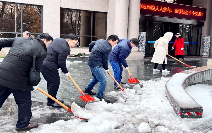 职工们带着扫把、铁锹等工具,积极踊跃的加入到铲雪除冰队伍中,虽然天气比较冷,冰层也很厚,但这一点也没有影响职工们的热情和工作效率。大家齐心协力,分工合作,配合默契,铲的铲、推的推、扫的扫,各种除雪工具与积雪厚冰的碰撞声响彻校园。