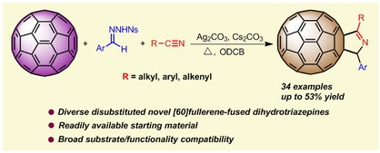Di Chao, Tong-Xin Liu,* Nana Ma, Pengling Zhang, Zheng Fu, Jinliang Ma, Qingfeng Liu, Fengjin Zhang, Zhiguo Zhang and Guisheng Zhang*. Silver(I)-mediated three-component annulation reaction of [60]fullerene, sulfonylhydrazones, and nitriles: leading to diverse disubstituted [60]fullerene-fused dihydropyrroles