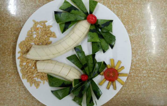 比赛分为八小组进行,按照规定依次领取水果以及拼盘用具。水果拼盘制作比赛限时十五分钟,学生们分工有序,积极制作,热闹非凡。各种水果在学生们的巧手下雕刻的栩栩如生,高大的椰子树、可爱的小红兔还有盛开的莲花。作品富有意境,现场气氛十分活跃。 在作品展示环节,每个小组派出代表展示并讲解自己小组的作品。西瓜皮、香蕉及瓜子相结合制作出的海滩椰子树充满夏日风情;番茄、黄瓜等制作的自然乐园活泼清新、色彩对比鲜明。学生们的作品各有千秋,寓意丰富。五位评委讨论并打出自己对每个小组的满意分数,比赛评出一等奖一名,二等奖三名,三等奖四名。