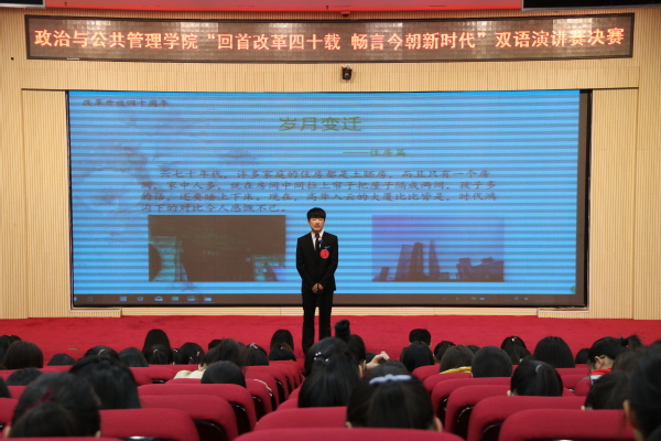 3月31日上午,由政治与公共管理学院团委学生会学习部举办的双语演讲比赛决赛于思政平台展开,学院2016级辅导员王卉,外国语学院部分优秀学生担任评委,学院学生近200人观看此次比赛。