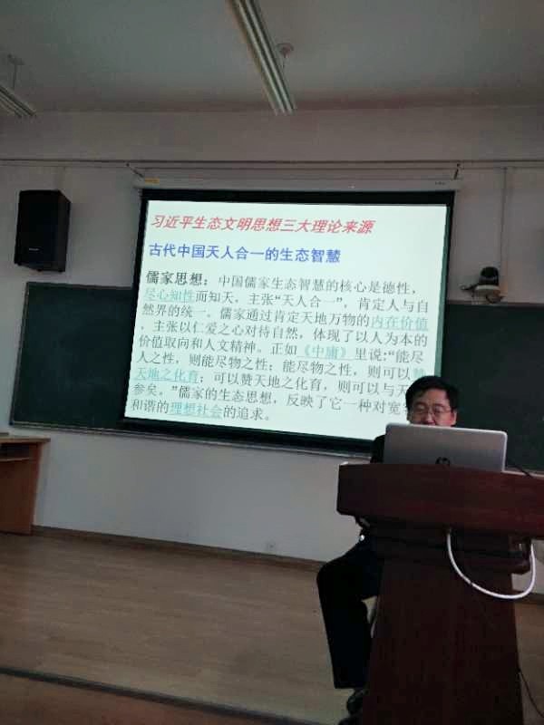 赵建军教授从习近平生态文明思想的形成、生态文明思想的科学内涵、生态文明思想的理论来源及十九大报告中关于生态文明建设的精神和思想精髓几个方面论述习近平的生态文明思想。首先,赵建军教授从思想的形成开始讲起,详细阐述了生态文明建设的重要性和必要性;其次,阐释了生态文明思想的科学内涵具体分成的八个方面;再次,赵建军教授重点讲解了习近平生态文明思想的三大理论来源即古代中国天人合一的生态智慧、马克思主义人与自然相统一思想和可持续发展理论。古代中国天人合一的生态智慧突出显示了中国古代儒家的天人合一、道家道法自然和佛家的众生平等的观点,并提出这是中国生态文明思想的重要来源;经典马克思主义观点为生态文明理论的主要基石;在进行中国特色社会主义建设的进程中提出的可持续发展理论为生态文明理论提供了代际平等、永续发展的思想。最后,赵建军教授阐述了如何吃透十九大报告中关于生态文明建设理论精神和怎样学习习近平生态文明思想精髓,并突出强调了做强做大绿色产业的重要性。