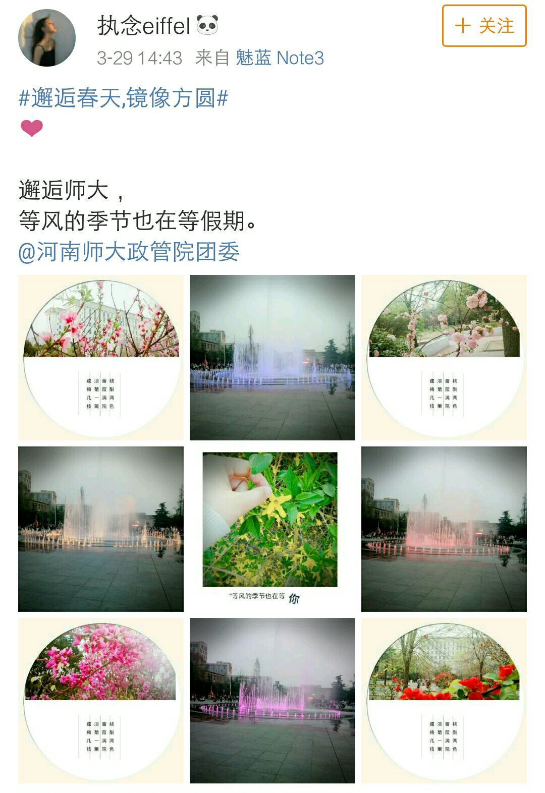 学生利用微博平台,采取图文结合的方式参与活动,以校园景色为素材,通过各色各样的春日美图来展现独特的校园文化魅力,表达自身对未来的美好憧憬。2016级政治学与行政学专业的曹莉娟以学校独具特色的喷泉场景为主,通过文字和景色的结合展现桃红李白的春日之美。2017级公共管理类专业的杜涵慧在镜头下捕捉校园绚丽多彩的早春花景,配之以唯美的自创小诗,别有一番春意味道。此次活动经过大众评审以及微信投票共选出一等奖一名,二等奖两名,三等奖三名,获奖作品于学院三大平台进行专栏展示。