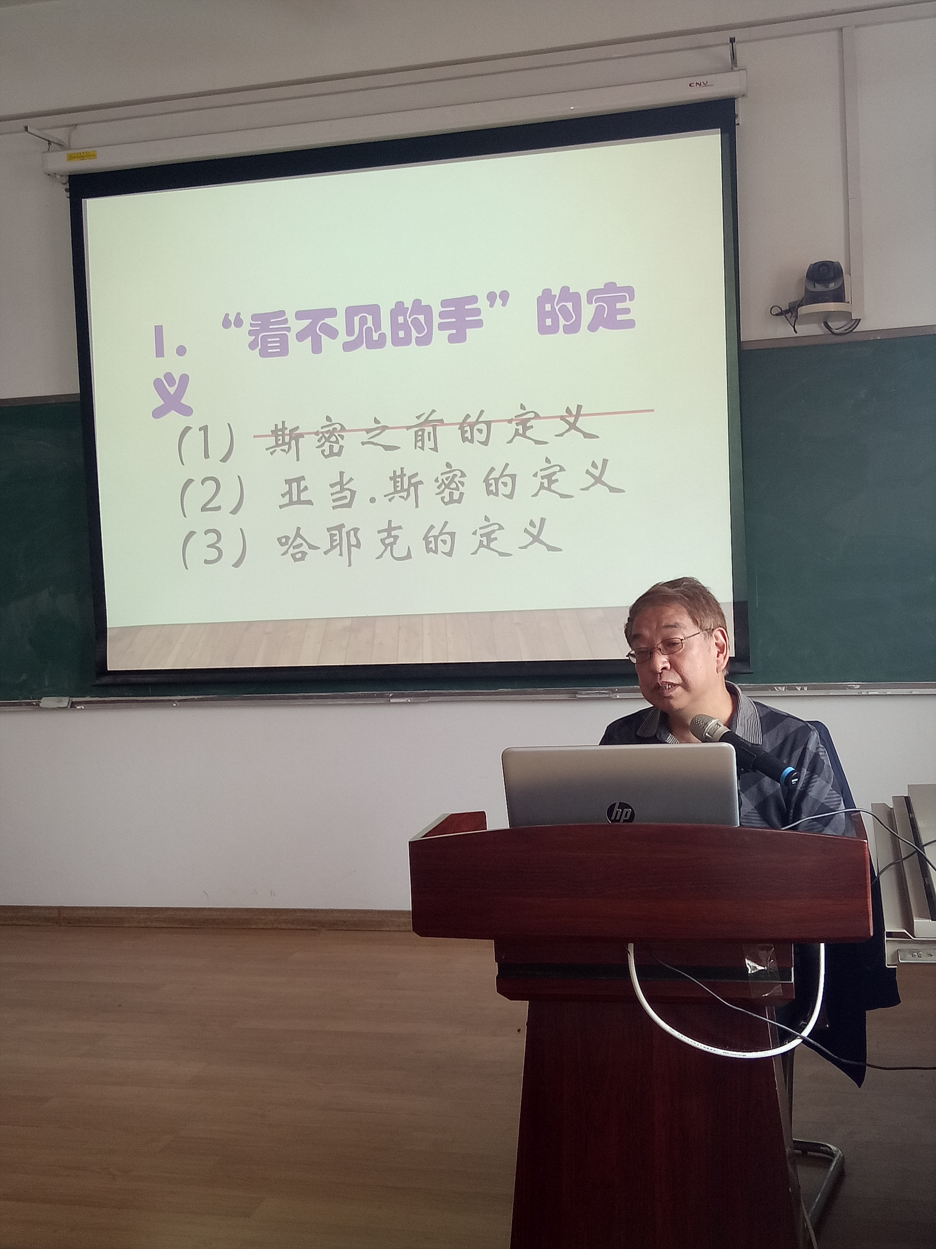 之后,乔洪武教授阐释了“看得见的手”及国家作用的定义,同样从三个方面进行讲解,首先介绍了亚当·斯密在1759年的著作《道德情操论》及其定义,之后介绍了李斯特在1841年的代表作《政治经济学的国民体系》及定义,具体说明了政府在经济中起到的重要作用;其次,重点讲解了凯恩斯主义的定义和政府干预经济的重要作用,并且比较了西方资本主义国家的国家资本主义和社会主义的计划经济的不同及国家资本主义的优点;最后,简单阐述了诺思和斯蒂格利茨对于国家干预的思想。在讲座的第三部分,乔洪武教授重点讲解了“两手论”的重大意义。第一,摒弃计划经济的传统思维。虽然计划经济有可以集中力量办大事的优点,但也有其局限性,不能一味地依靠计划经济;第二,“看得见的手”要保护“看不见的手”即国家的力量要保护市场的持续发展;第三,“两只手”要形成合力,只有政府的力量和市场的自我调节有效地结合在一起才能使中国的经济不停地发展。乔洪武教授的讲座使在座师生受益匪浅,他严谨的措辞、深刻的研究、风趣的讲解受到了在座师生的一致好评。