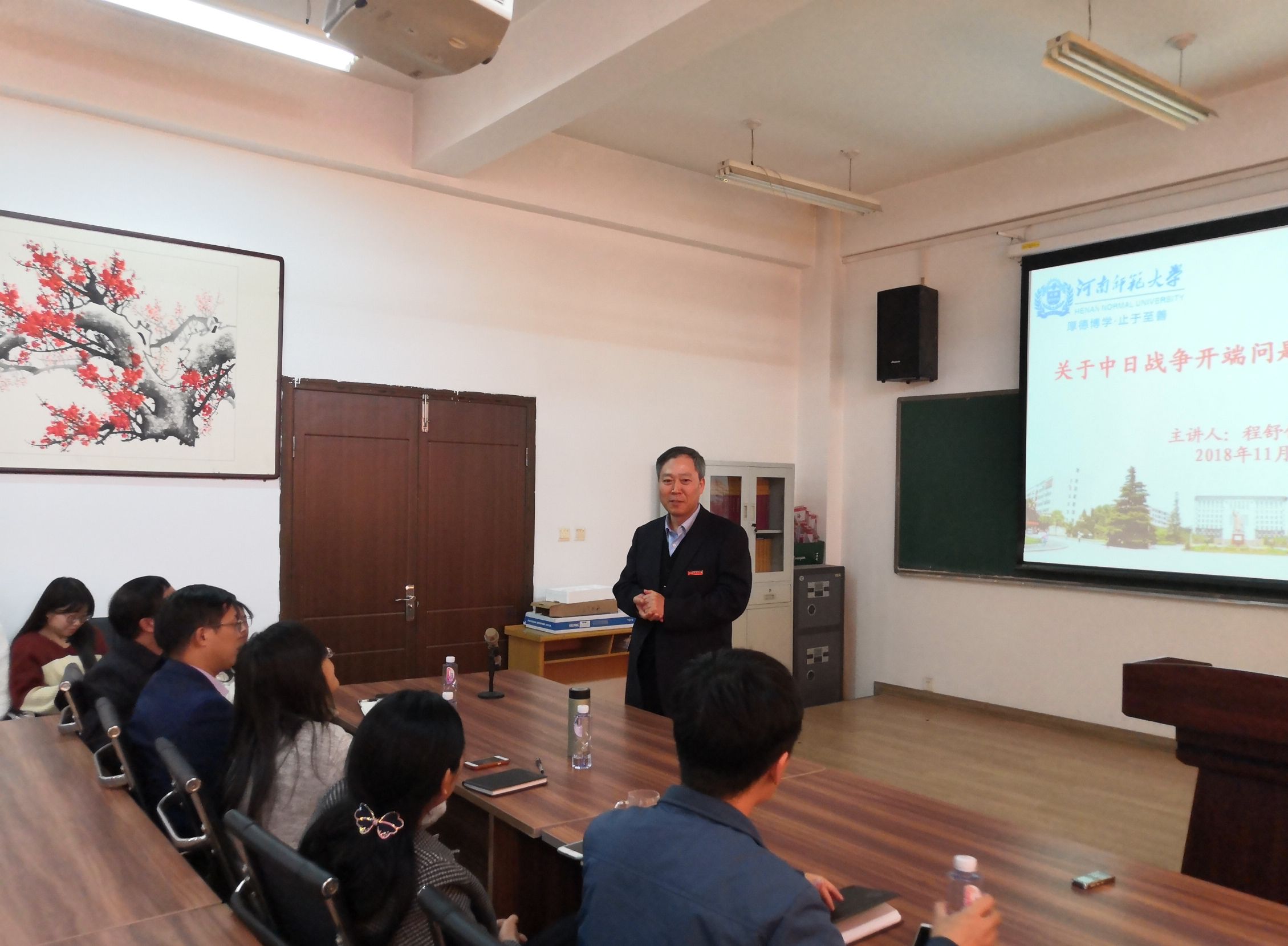 本次研讨会以“关于中日战争开端问题的几点认识”为主题,程舒伟从中日战争开端问题的历史性和差异性、承认九一八事变是中日战争开端的必要性和重要性四个方面进行了细致全面的讲解。他指出,大陆、日本、中国台湾专业学者在编写中日战争论著时虽然都从九一八事变写起,但由于思想保守,右翼倾向,战争的特点及中日学者观点的差异,使得开端时间问题的修改被忽视,直到2017年正式将九一八作为中日战争开端写进中小学教材。同时,他讲到,九一八事变后我国主要矛盾及社会性质均发生变化,承认九一八事变是中日战争的开端是对历史的尊重,保持了抗日战争的完整性,肯定了中国在反法西斯战争中的历史作用。在场师生认真聆听,交流讨论,纷纷表示受益颇深。