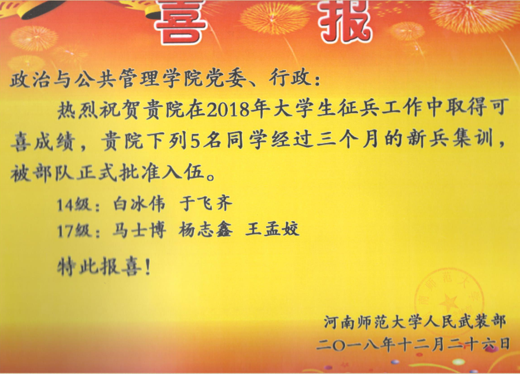 近日,我校人民武装部向政治与公共管理学院党委、行政发来喜报,表彰我院在2018年大学生征兵工作中取得的可喜成绩。学院2014级学生白冰伟、于飞齐,2017级学生马士博、杨志鑫、王孟姣五名同学经过三个月新兵集训,被部队正式批准入伍。