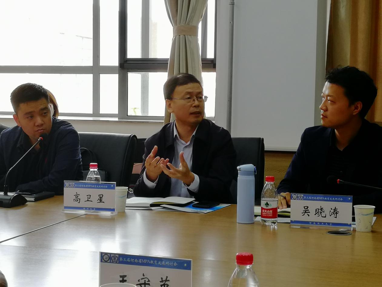 接下来,河南财经政法大学张茂松教授、新乡医学院孟勇教授、华北水利水电大学何楠教授、河南大学姬志闯教授、河南理工大学吴晓涛教授以及郑州大学高卫星教授纷纷做了精彩发言,在座的其他代表们都认真倾听,总结了各自院校在MPA培养过程中所面临的问题及应对措施,对MPA未来的发展提出新的疑问。丁煌教授针对每个院校代表的发言一一做了回应,指出当前MPA培养质量有些参差不齐,对干部管理、申报制度、专职教师聘任等问题发表了见解,大家的疑问都茅塞顿开,代表们均表示感谢丁教授的指导。