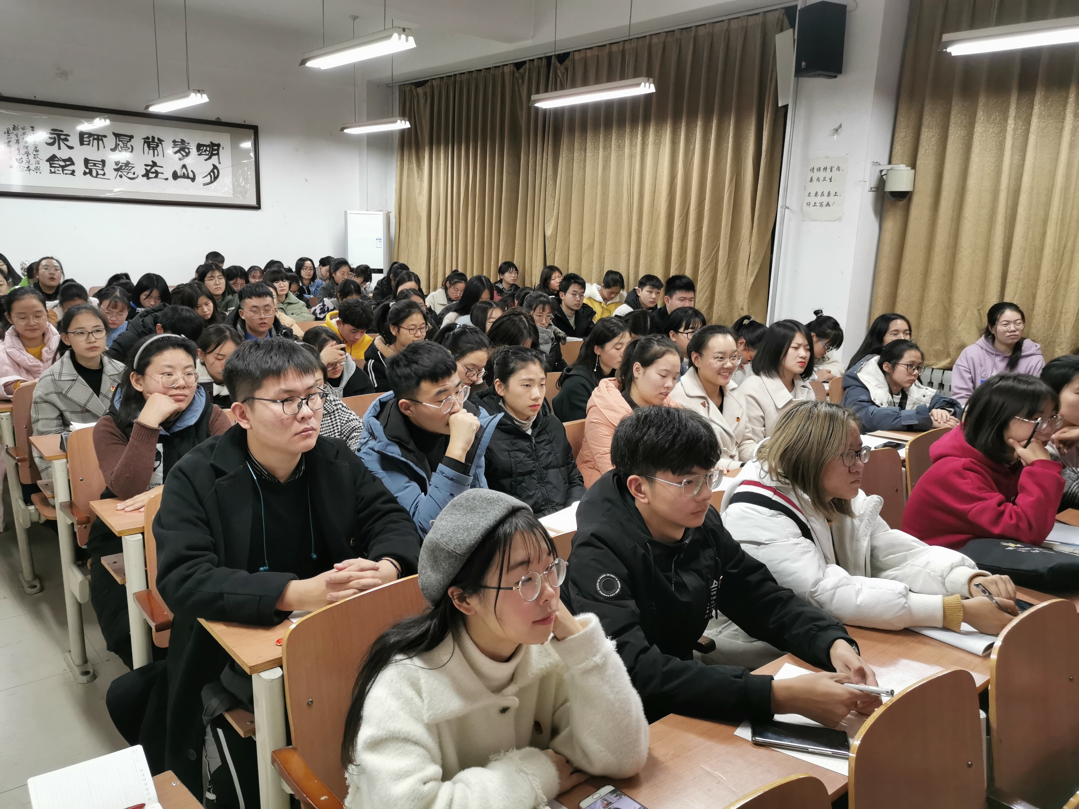 讲座伊始,刘英基以全会通过的《决定》引入话题并从“两个一百年”“改革开放”以及“赢得主动权”三个方面讲解此次全会的重大意义。随后,他以国家经济建设取得的巨大成绩与自己的亲身体验为例,为在场师生讲解了中国特色社会主义制度和国家治理体系的显著优势,简单介绍了在中国共产党的领导下,坚持和完善发展中国特色社会主义制度、推进国家治理体系和治理能力现代化的总体要求、总体目标与重点任务。他希望在场师生能够不断增强“四个意识”,坚定“四个自信”,做到“两个维护”,努力提高自身的政治站位,树立崇高的理想目标,为实现中华民族的伟大复兴而不断努力。本次讲座内容丰富,逻辑清晰,语言幽默,在场师生仔细记录,认真聆听。