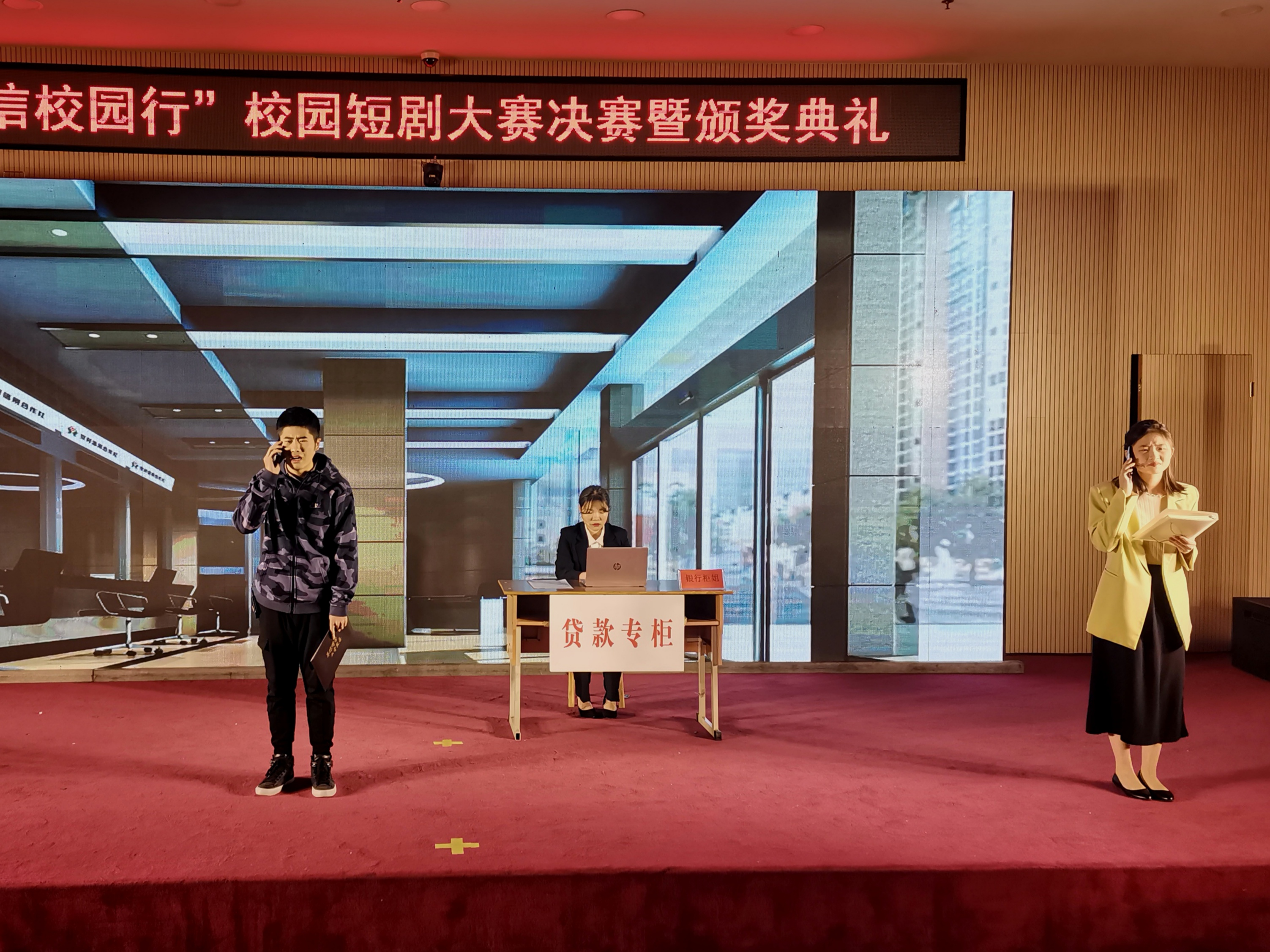 舞台上,他们以校园地国家助学贷款为切入点,取材大学生校园生活故事,讲述了主人公在享用国家助学政策带来的益处却未能按时偿还贷款而留下失信记录,后在老师的批评教育下积极还清贷款、坚守诚信品质的故事,突出了校园地国家助学贷款帮助贫困学子追梦圆梦,更表达了“人无信而不立”这一主题。最后,演员们的精彩表演受到了评委的一致好评,我院参赛团队喜获一等奖,牛鑫雨获得最佳导演奖。此外,我院荣获优秀组织奖。