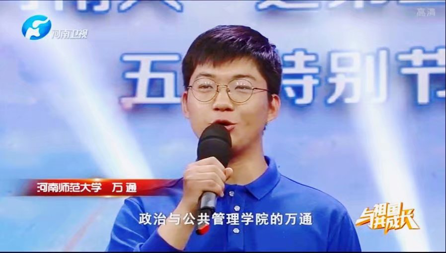 5月4日晚,由中共河南省委宣传部、中共河南省委高校工委、河南省教育厅主办,河南广播电视台卫星频道、河南教育报刊社教育时报承办的“出彩河南人”最美大学生五四特别节目——《与祖国共成长》于河南卫视播出。“青春众志•教育守护成长”在线助学团队发起人之一,我院2017级思想政治教育专业学生万通应邀参加节目。