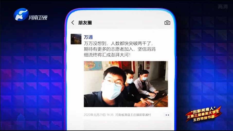 万通讲到,在疫情爆发之初,他便与同村伙伴成立志愿服务团队以支持抗“疫”工作,但在疫情逐渐严峻,各级学校纷纷延迟开学的情况下,团队因时而动,结合实际情况招募大学生志愿者构建网络空中课堂,在发挥专业特长的同时结合自身成长经历,力争对存在学业和心理困扰的中小学生展开有针对性的线上辅导。在被问及活动收获时,万通认为作为新时代的青年,应当勇于创新实践,努力增长学识,集结力量回报祖国,用青春谱写无悔担当。