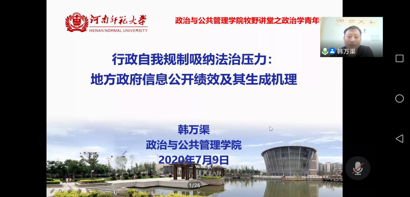 2020年7月9日上午,我院韩万渠副教授在牧野讲堂之政治学青年论坛做了一场题为《行政自我规制吸纳法治压力:地方政府信息公开绩效及其生成机理》的专题讲座。这场讲座由王鹤亭副教授主持,原晶晶副教授、张立国博士评议,与会人员有政治与公共管理学院部分教师、研究生、本科生。