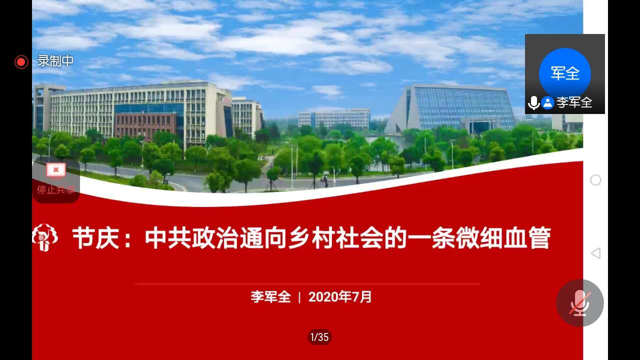2020年7月17日上午10点30分,李军全副教授在牧野讲堂做了题为《节庆:中共政治通向乡村社会的一条细微血管》的专题报告。报告会由政治与公共管理学院韩万渠副教授主持,巴志鹏教授、陈莉莉副教授和高斐副教授评议。与会人员有政治与公共管理学院部分教师、研究生和本科生。