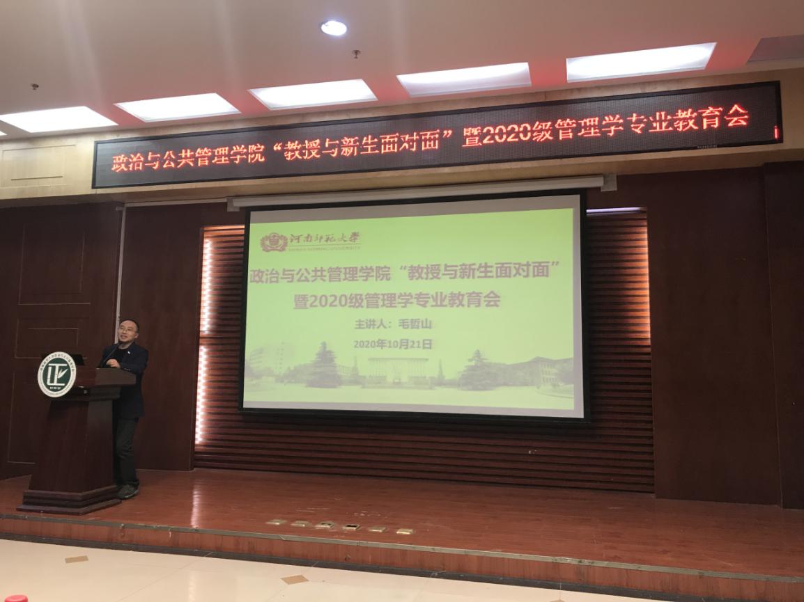10月21日下午,政治与公共管理学院于东区模拟法庭举行“教授与新生面对面”暨2020级管理学专业教育会。学院管理学教研室教师代表,2020级专兼职辅导员,2020级公共管理类专业和城市管理专业全体学生参与其中。会议由政治与公共管理学院管理学教研室主任毛哲山主持。