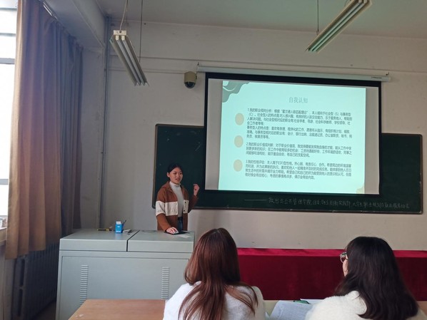 活动伊始,主持人介绍比赛到场评委、比赛规则和评分要求。随后,十五个参赛选手依次上台进行PPT汇报展示。参赛选手分别从自我分析、环境分析、职业目标定位、职业规划以及评估与反馈等多个方面展开分析。王怡宁表示自己未来想做一名政治老师,并对制定未来职业的原因和具体方法进行阐述。陈侨依以“国企职员”为职业目标,阐述了短、中、长期目标以及相应的实施计划,为今后的职业发展作出具体规划。活动最后,评委们对选手表现进行打分,并对比赛环节中存在的问题提出了建议。