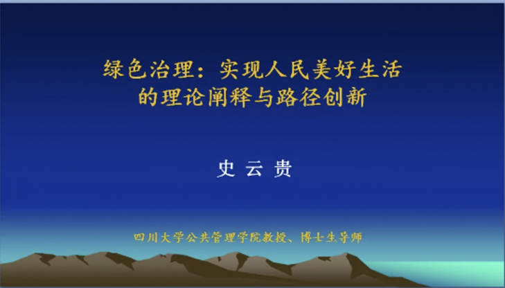 史云贵教授以《绿色治理:实现人民美好生活的理论阐释与路径创新》为主题,梳理了治理理论发展脉络,结合中国五大发展理念,指出我国进入国家治理2.0的绿色转型期,人民美好生活愿望倒逼高要求的治理模式与路径创新,从绿色政治理论引出绿色治理理念。接着,他从绿色治理的概念与目标,以绿色治理不断满足人民美好生活需要的理路两个方面详细阐述了实现人民美好生活的理论基底与治理路径。他指出,绿色治理是顺应新时代高质量发展要求的具有中国特色的治理概念,广义的治理在人类社会由统治经管理走向治理的过程中走过了一条“颜色轨迹”。为实现人民美好生活的绿色治理目标,史教授提出,需在空间正义的基础上,坚持人与自然伙伴相依为命的命运共同体理念,打造以公园城市为载体的新型城市治理形态,并要以绿色产业为基础,绿色政策为驱动、以生态治理为基础路径、多元共治为治理逻辑、以全面推进绿色政治文化,加快推进绿色行为自觉、以公园社区建设为抓手,推进城市绿色“微治理”、以绿色治理质量测评为着力点等方面,全面贯彻五大新发展理念,“五链”同步,生产生态生活有机融合,破解城乡分野,建设全域公园城市,实现人民美好生活目标,建设美丽中国。