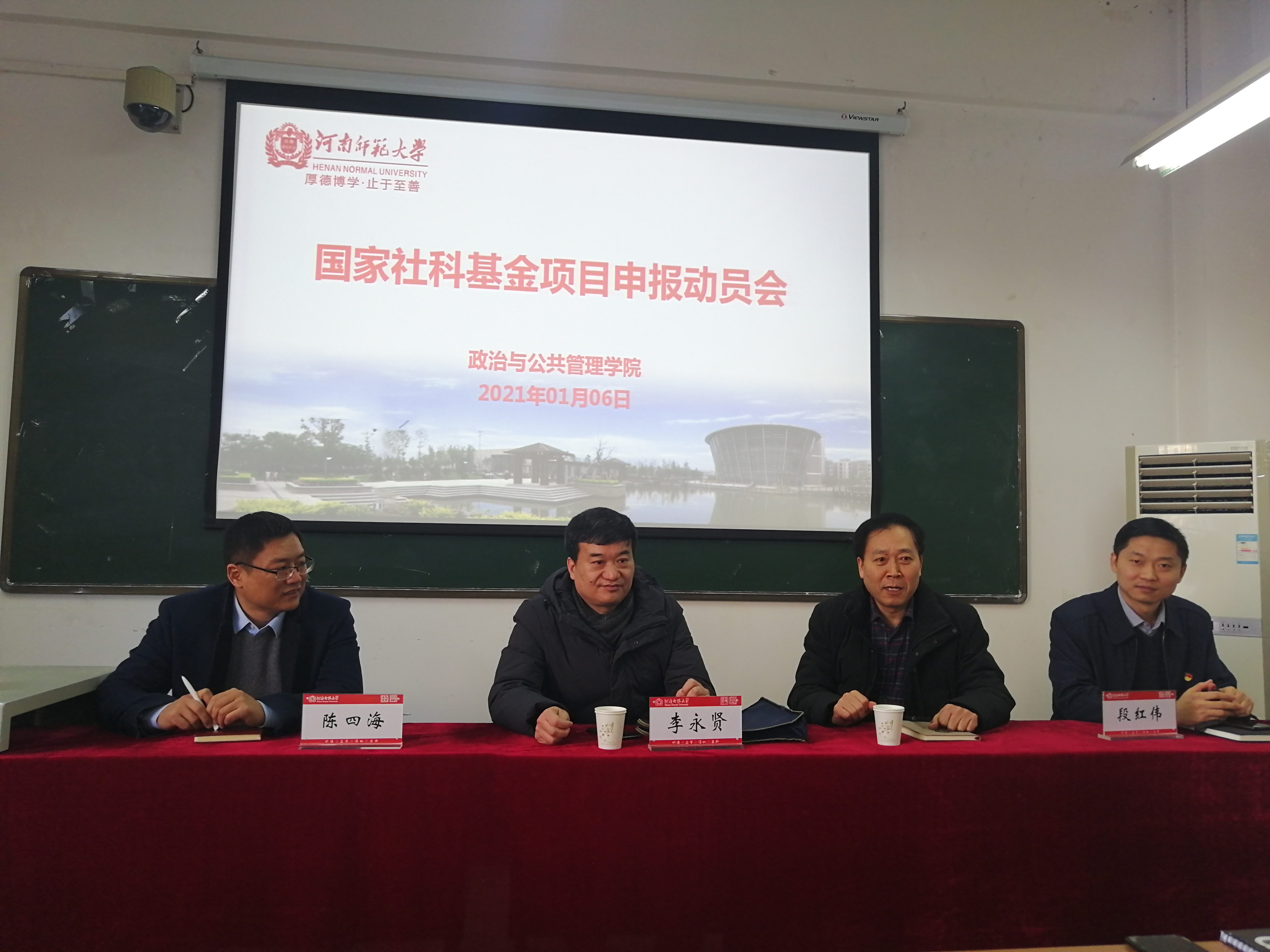 1月6号上午,政治与公共管理学院在学院217召开2021年度国家社科基金项目申报动员会。学院领导及符合国社科申报条件的30余位教师参加此次会议。会议特邀社科处李永贤处长莅临指导工作。会议由学院党委书记段红伟主持。