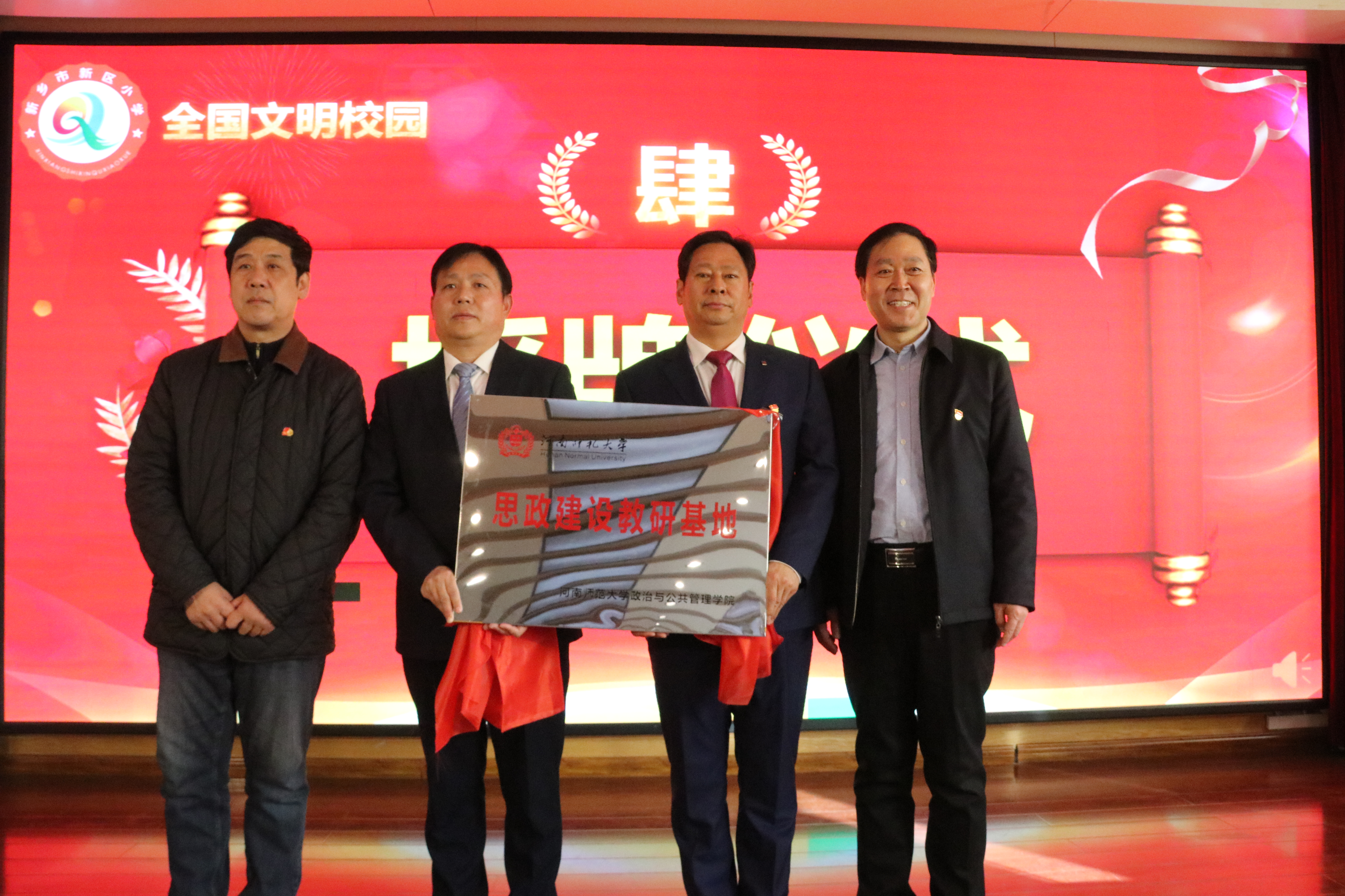 随后,李洪河院长、杜灵来教授与新区小学李克兴校长、彭俊生书记共同为思政建设教研基地揭牌。