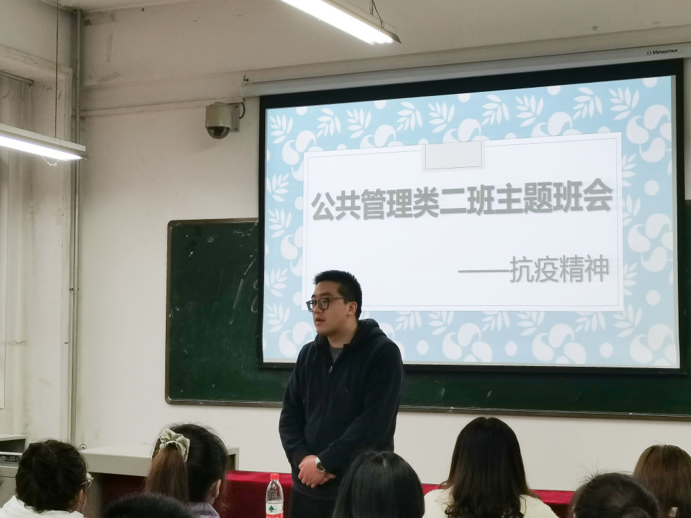 2020级公共管理类二班以抗疫英雄事迹为主轴,通过演讲者间的对话与互动,讲述防疫抗疫一线的感人故事,展现中国的大国担当和人民力量,在场学生深刻意识到作为青年大学生的责任与使命。马文韬总结近期工作,强调了严格请假制度、班级学风建设等问题,并希望学生能够养成良好的读书习惯,同时表示要以先进英雄为榜样,弘扬伟大抗疫精神。