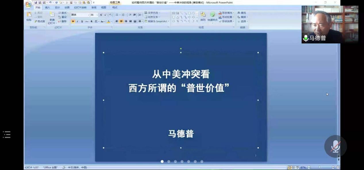 5月12日下午,应学院的邀请,天津师范大学政治与行政学院马德普教授为我院师生作了题为《从中美冲突看西方所谓的“普世价值”》的线上专题报告。报告会由学院院长李洪河院教授主持,学院部分教师、研究生和本科生等百余人参与。