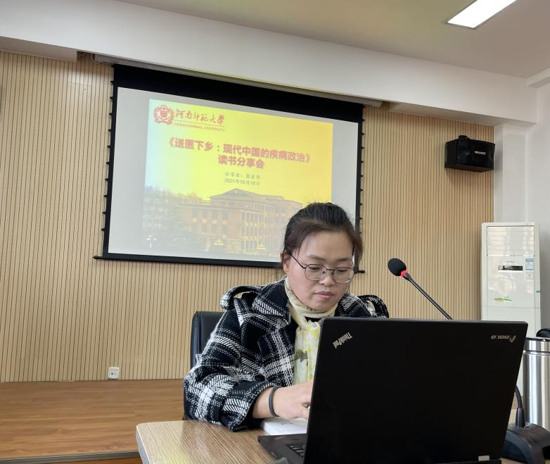 10月18日下午,2020级葛素华作了《送医下乡:现代中国的疾病政治》的读书分享。她从师承关系上解释作者为何关注国家政权以及如何“送医下乡”,自然引出以农村地区缺医少药的现实镜况需要“送医下乡”,并详细导读了作者如何将其上升为现代国家构建的逻辑思路。