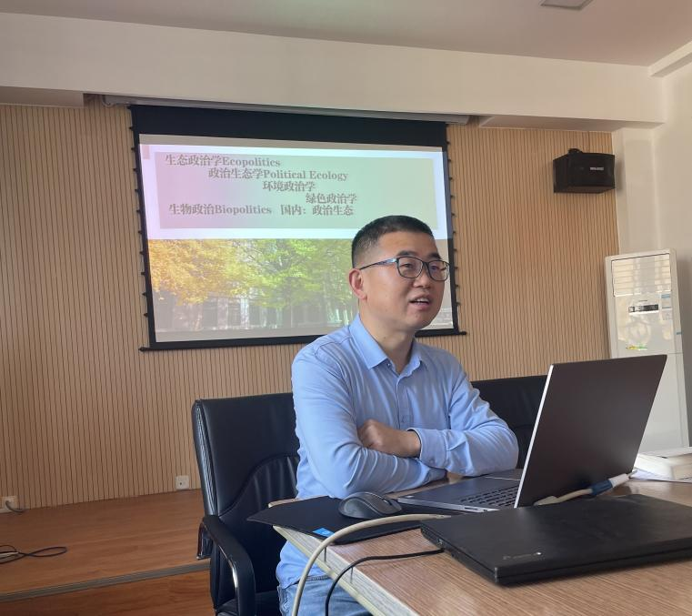 10月27日上午,2021级赵永奇立足当今学术界研究热点“生态政治与政治生态”,导读了科斯京的《生态政治学与全球学》,从生态政治学与全球学的方法论基础讲到全球安全政治,从生态安全政策与全球发展讲到人类社会问题和全球安全。分享过程中融入中国话语和中国故事,以小见大,内容丰富。