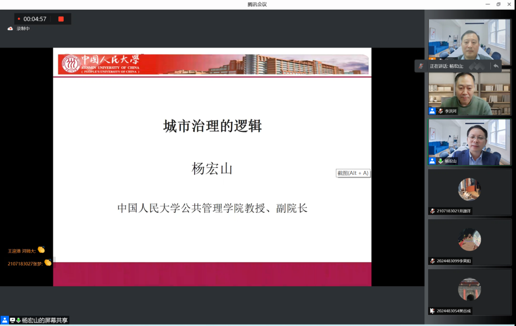 11月21日下午,应政治与公共管理学院邀请,全国MPA教育指导委员会副秘书长、中国人民大学公共管理学院副院长杨宏山教授在“腾讯会议”上为我院师生作了题为《城市治理的逻辑》的学术报告。报告由学院院长李洪河教授主持,我院部分教师、研究生、本科生参与学习。