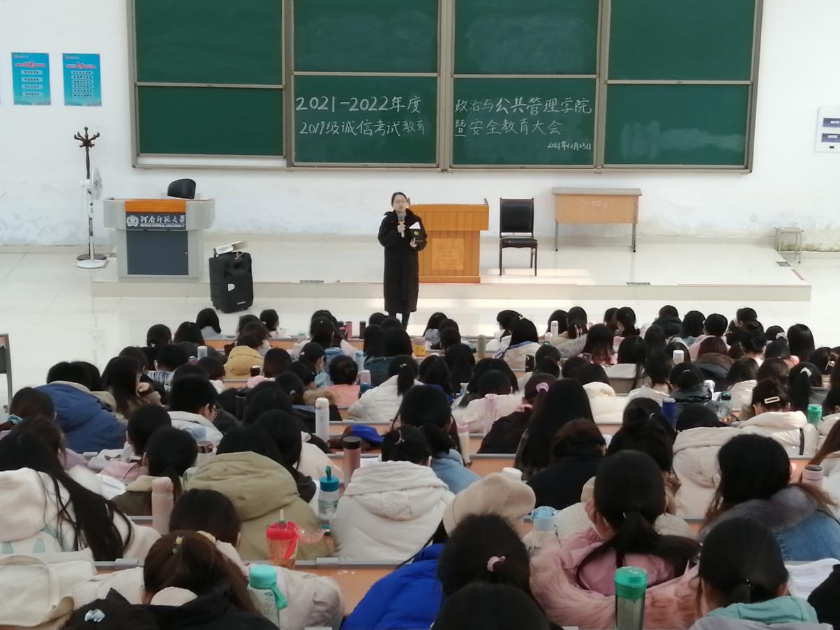 11月23日,政治与公共管理学院于文昌楼102室召开诚信考试教育暨安全动员大会,2019级兼职辅导员王璐璐、齐梦雪及2019级全体学生参与其中。