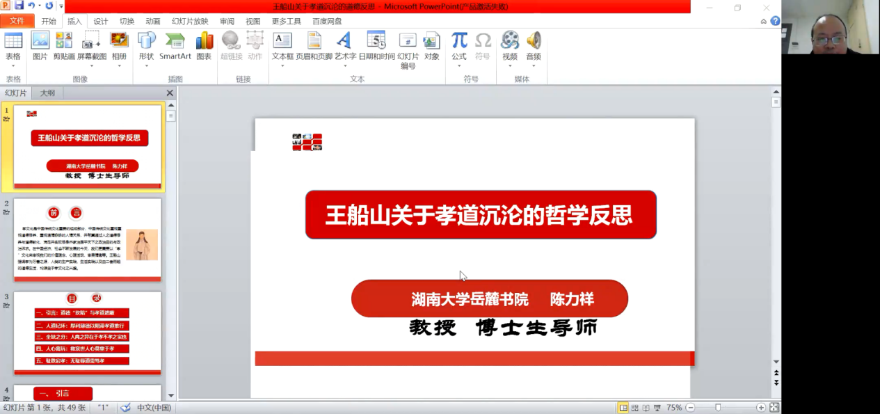 1月15日上午,应政治与公共管理学院邀请,湖南大学岳麓书院陈力祥教授应邀在线作了题为《王船山对孝道沉沦的哲学反思》的学术报告,报告由学院院长李洪河教授主持,来自全国多所高校的本科生、研究生和博士生参与学习。