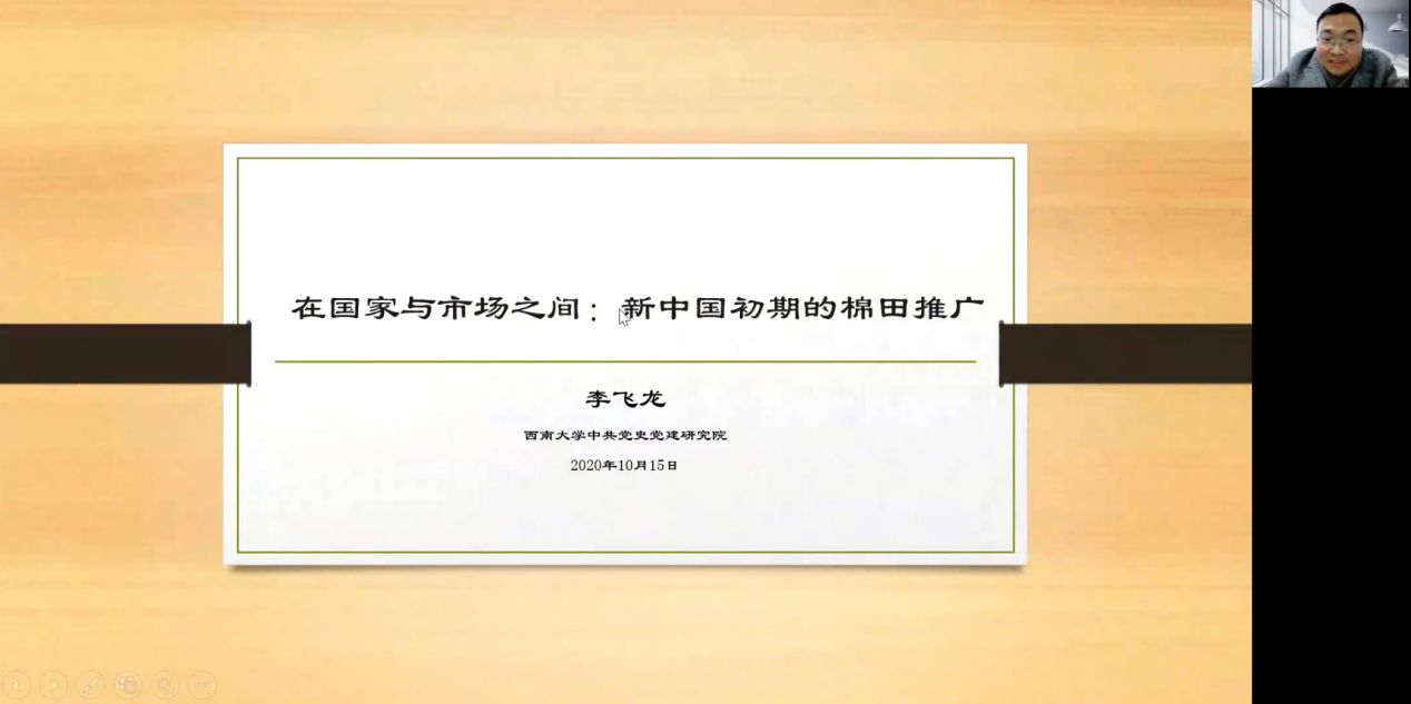 1月15日上午,应政治与公共管理学院邀请,西南大学中共党史党建研究院李飞龙教授在线作了题为《在国家与市场之间:新中国初期的棉田推广》的学术报告。报告由学院院长李洪河教授主持,来自全国多所高校的本科生、研究生和博士生参与学习。