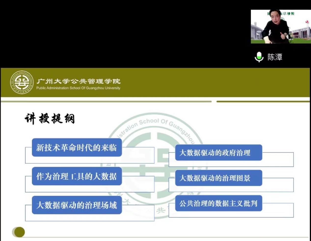 4月25日下午,应政治与公共管理学院邀请,广州大学公共管理学院院长陈潭教授在线上作了题为《数字时代的治理革命》的学术报告,报告由学院副院长韩万渠主持,相关专业教师、研究生和本科生参与。