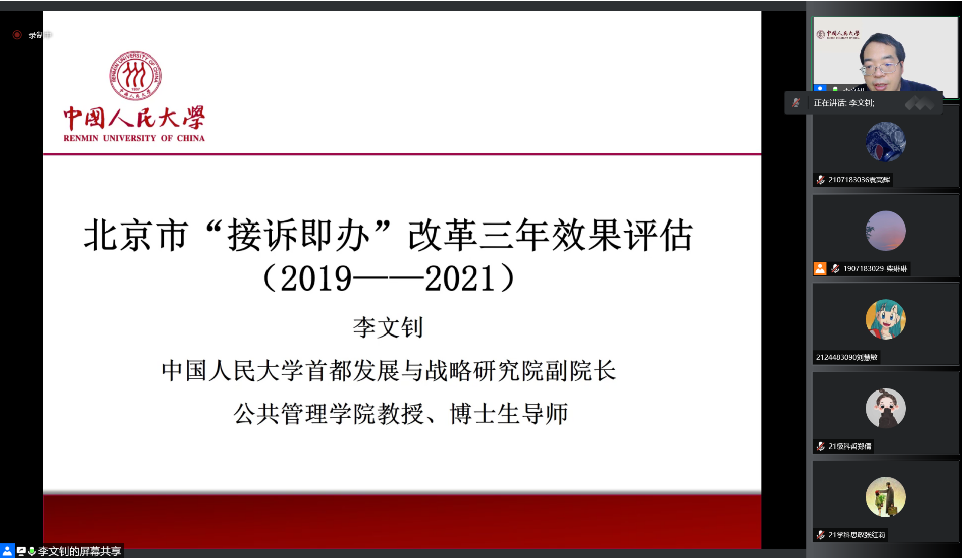 6月1日晚,应政治与公共管理学院邀请,中国人民大学公共管理学院党委副书记李文钊教授在线上为学院师生作了题为《北京市“接诉即办”改革三年效果评估(2019-2021)——基于CIPP模型的视角》的学术报告,报告由学院副院长韩万渠主持,相关专业教师、研究生、本科生参与。