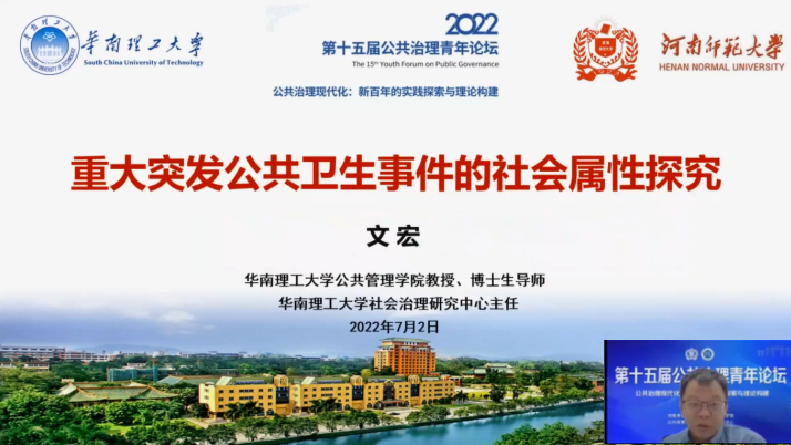 7月2日上午,应政治与公共管理学院邀请,华南理工大学公共管理学院文宏教授在线作了题为《重大突发公共卫生事件的社会属性探究》的学术讲座。报告由山东大学王佃利教授主持,校内外1300余名师生参与。