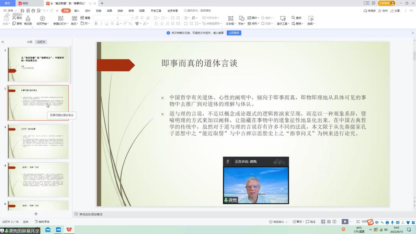 8月15日上午,应政治与公共管理学院邀请,中山大学龚隽教授在线上为学院师生作了题为《能近取譬:中国古典哲学的一种说理方式》的学术报告。报告由学院副院长韩万渠主持,校内外200余名师生参与。