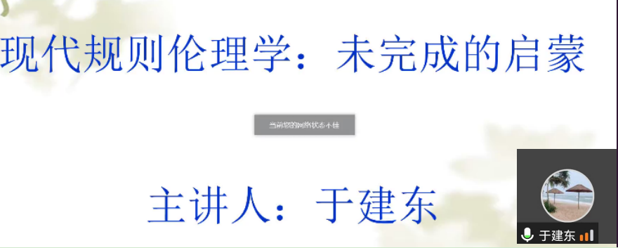 9月24日下午,政治与公共管理学院哲学重点学科第十八期哲学沙龙在线上举行。本期哲学沙龙邀请学院于建东副教授进行题为《现代规则伦理学:未完成的启蒙》的学术报告,张家海博士和程丽君博士担任与谈人,陈永庆博士担任主持人。学院相关专业教师、研究生、本科生等40余人参与。