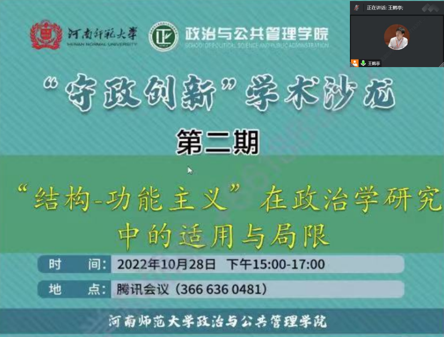 10月28日下午,政治与公共管理学院政治学重点学科第二期“守政创新”学术沙龙在线上举行,本期沙龙邀请学院副院长王鹤亭教授作了题为《“结构-功能主义”在政治学研究中的适用与局限》的学术报告,艾昆鹏副教授担任主持人,学院相关专业教师、研究生、本科生等130余人参与。