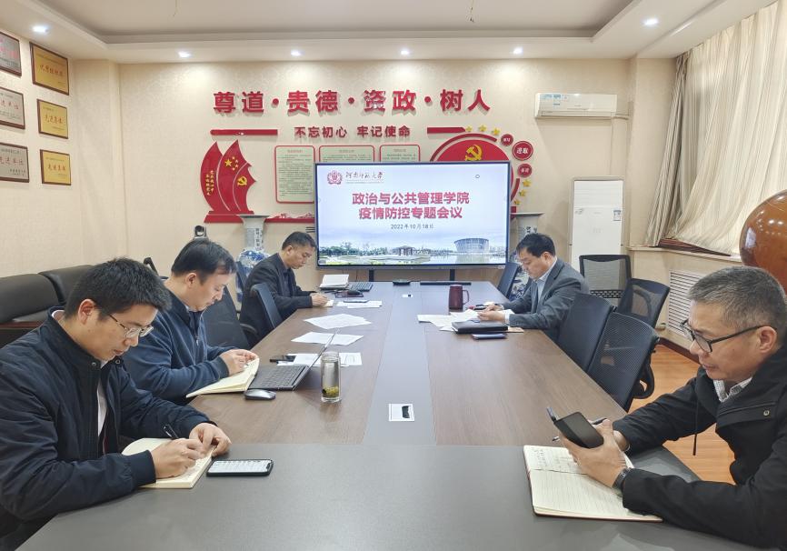 10月18日,政治与公共管理学院召开疫情防控工作专题会议,分析研判疫情防控形势,制定疫情防控工作预案。学院党委书记赵红杰传达上级会议精神,并对值班值守、信息接转报送、师生管理、教学安排、监督检查等方面全方位部署,做到防控工作有章可循、有规可依。各部门负责人具体汇报相关工作内容,排查风险隐患,推动疫情防控措施有效落实。