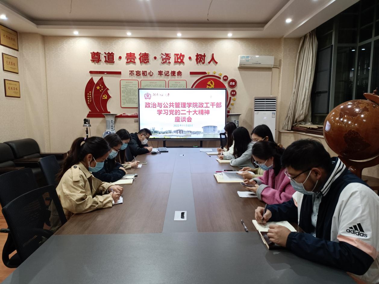 为深入学习贯彻党的二十大精神,11月3日晚,政治与公共管理学院于学院214召开政工干部学习党的二十大精神座谈会,学院相关负责人及各年级专兼职辅导员参与其中。