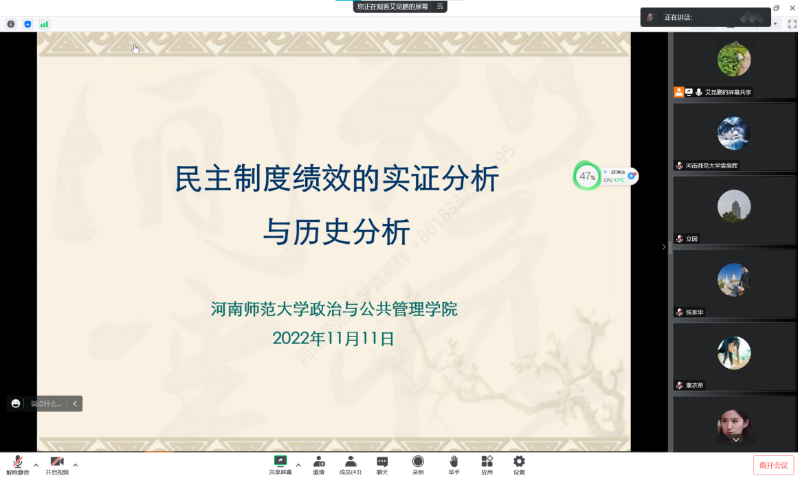 11月11日下午,政治与公共管理学院政治学重点学科第三期“守政创新”学术沙龙在线上举行,本期沙龙邀请学院艾昆鹏副教授作了题为《民主制度绩效的实证分析与历史分析》的学术报告,学院相关专业教师、研究生、本科生等60余人参与。